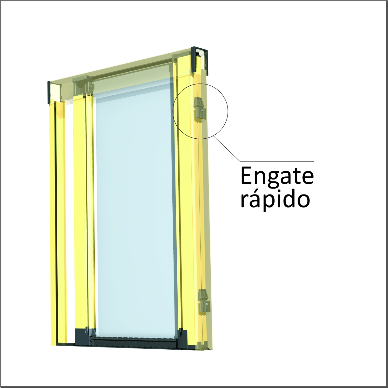 É um novo e elegante modelo de fechamento de porta mosquiteira, consiste em uma mescla do sistema recolhível horizontal com o sistema de corrente, aliando desta maneira facilidade de uso e conforto.